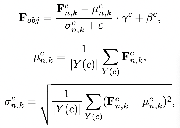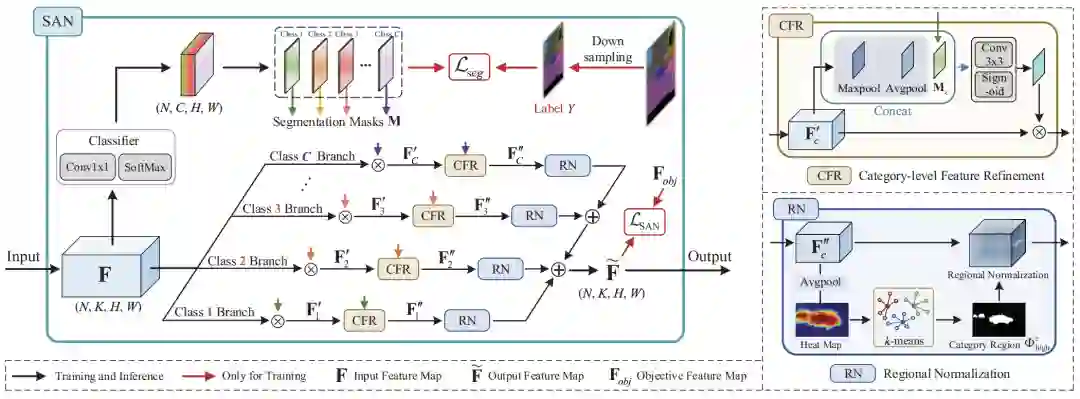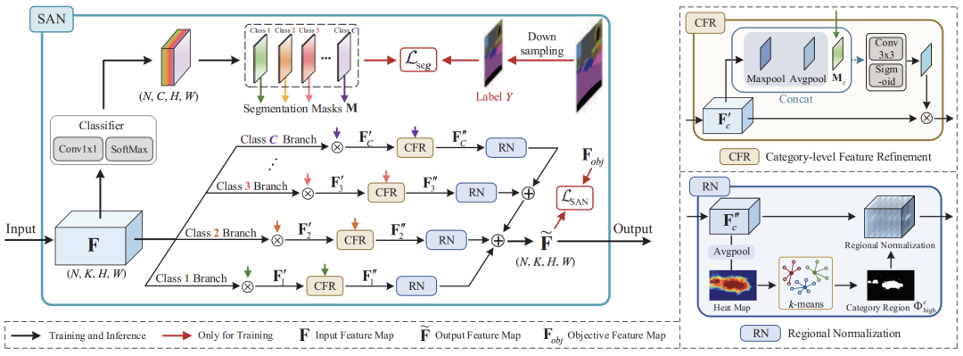 SAN模块设置了一个归一化后的特征图真值F_obj, 它是通过对编码器提取的特征图 F 进行如下类别级别的实例归一化后得到的:
