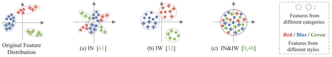 从如图1 (b)也可观察得到,特征虽然均匀分布了,但是却也没有对齐特征的联合分布。最近有论文研究表明,如图1 (c)所示,联合IN与IW后,能够对齐来自不同域(即数据分布不同)的联合特征边缘分布。然而,图1 (c)中也可以观察到虽然特征边缘分布得到了对齐,但是条件分布却依然处于没有对齐的状态,每个类别的分布仍然混合在一起以至于难以区分。