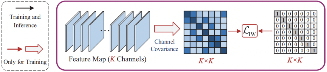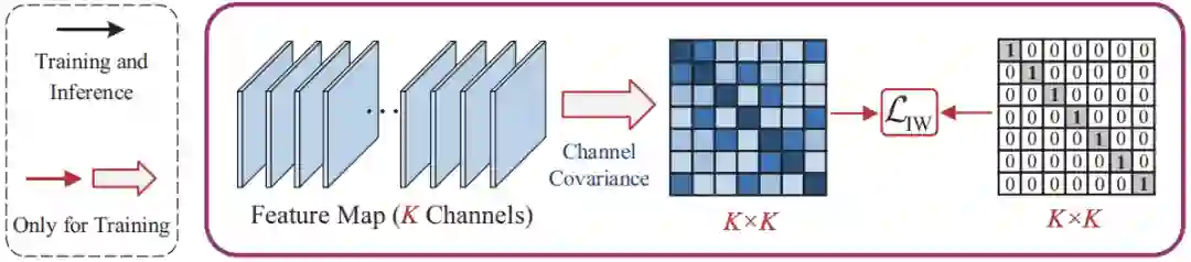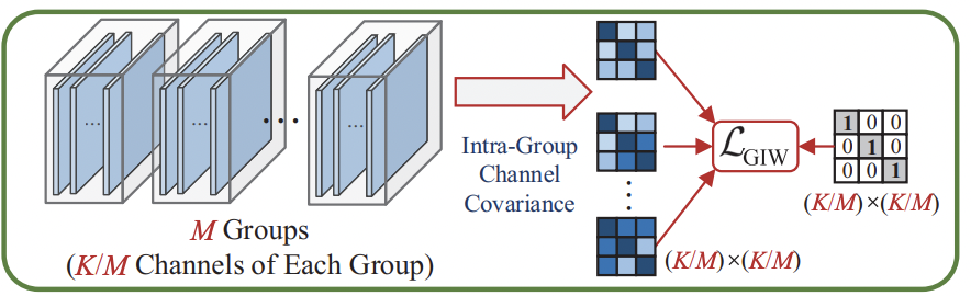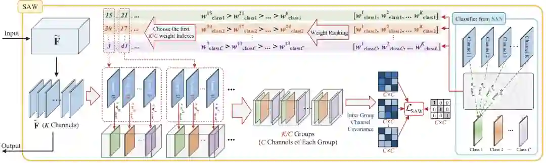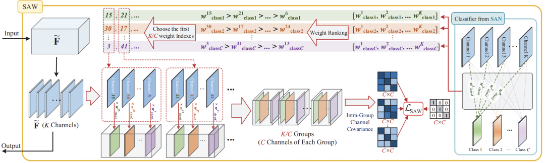 然而,GIW只对相邻通道特征图进行去相关性操作,却没有考虑寻找更合适的通道组合。我们知道,每个通道的特征实际上提取的是对应某一个类别的关键语义信息。因此,我们可以以语义类别的信息来进行分组。这个语义信息就来自SAN中的Classier中的权重。它代表了特征图中每个通道的特征图对不同类别的重要程度。对这个进行排序,然后依次取出对应的特征图便可以得到分组后的特征。一共选取了K/C组,每组C个通道。分组之后计算与图6中的L_GIW形式一致的损失函数L_SAW即可。