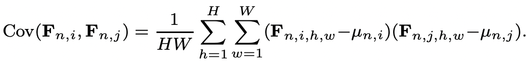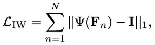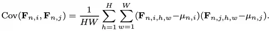 其中,F_n,k,h,w 表示一个 mini-batch 对应的特征图 F 中第 n 个 sample 的第 k 个通道特征图上空间位置为(h,w)上的特征值。但是如图1 (a)所示,使用IN只实现了特征分布的中心对齐,但是无法对齐特征的联合分布。而如图1 (b)所示, 由于IW 可以消除各通道特征间的线性相关性,所以使用 IW 后可以形成均匀分布的良好聚类特征。IW的具体工程可以由以下公式来表示: