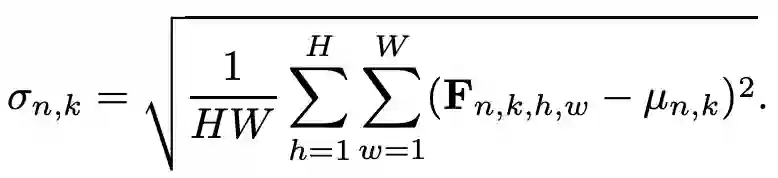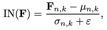 另一个方向来增强泛化能力的方式是使用Normalization 和 Whitening,该方向的方法利用实例归一化(Instance Normalization, IN)或实例白化(Instance Whitening,IW)对不同样本的特征分布进行标准化。IN分别对单个图像的每个通道的特征进行标准化归一化,以减轻由于样式变化引起的特征不匹配。IN的具体过程可以由以下公式来表示: