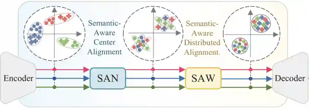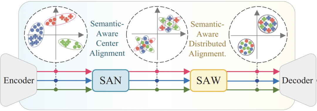 也就是说,在原有分割模型编码器-解码器的结构框架上插入了两个即插即用的模块:Semantic-Aware Normalization (SAN)与Semantic-Aware Whitening (SAW)。它们分别基于IN与IW而设计: