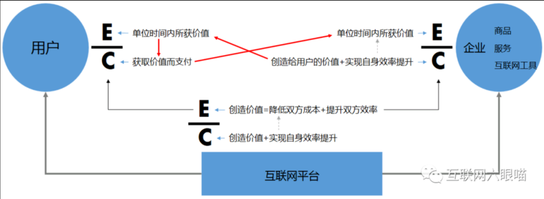 互联网的商业模式是以自己的成本,创造价值(企业自身也需要遵循E/C的模型),从而形成业务模式,帮助使用群体降低使用成本,提升使用效率。当所提供的价值和付出的成本都进行价格化,并固定了两者关系之后,便形成了商业模式。