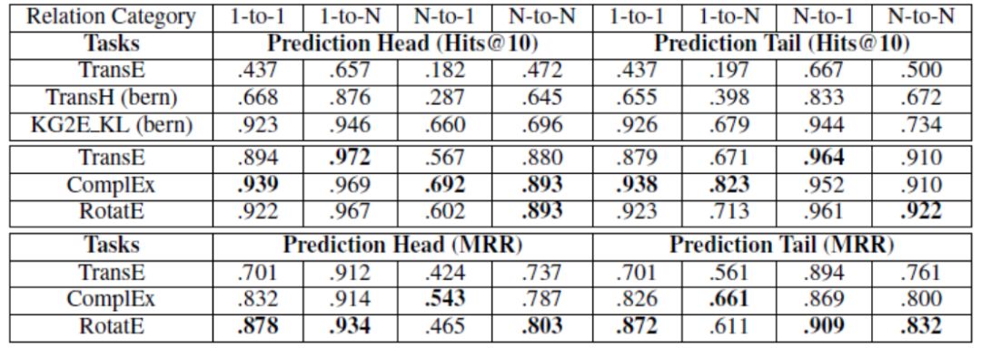 进一步研究 RotatE 模型在不同关系类型上的性能:1-N、N-1 和 N-N。在 FB15k 的结果如下表: