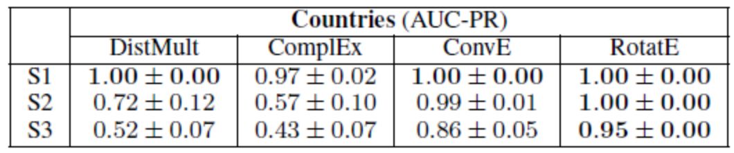其中除了 TransEh 和 ComplEx 方法,还添加了 KG2E_KL 方法进行对比,它是一种知识图嵌入方法的概率框架,旨在用 TransE 模型对知识图中实体和关系的不确定性进行建模,并且发现这种方法始终具有较好的性能,这也展示了在知识图谱中建模不确定性的重要性。