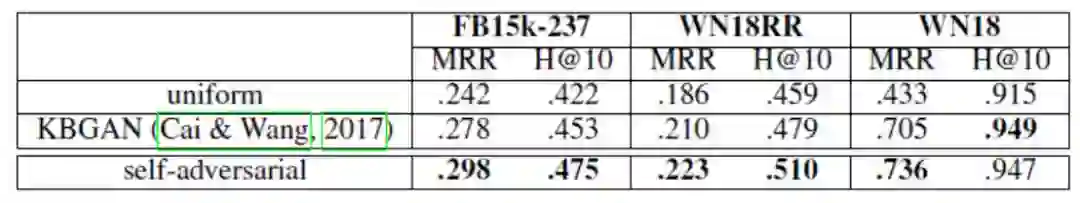 本文同样也研究了如何有效地进行负采样的问题,之前已有一些模型提出了生成对抗学习框架进行负采样 (KBGAN),可是这种框架要求同时训练嵌入模型和一个离散的负样例生成器,导致了难以优化和昂贵的计算代价。