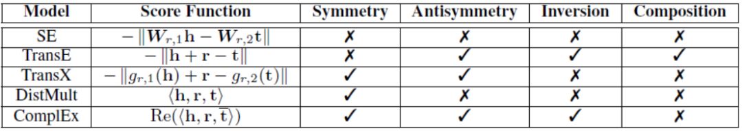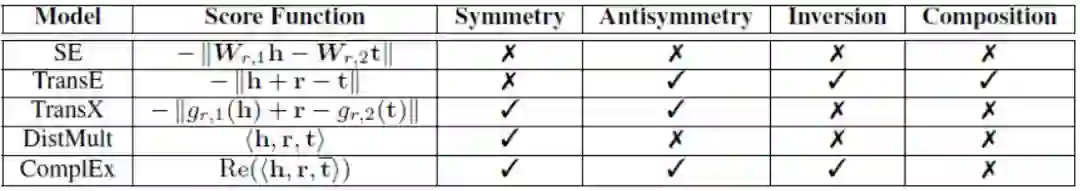 2. TransX 模型是 TransE 模型的变形,当 gr,1=gr,2 时它可以构建对称/反对称模式,但是不能推断逆和组合模式,因为 gr,1、gr,2 是可逆矩阵乘法;