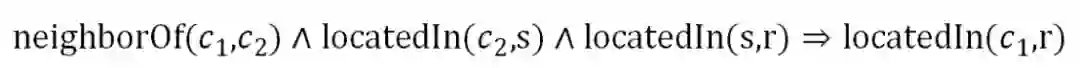 和一般的知识图谱中的链路预测不同,在该数据集上的查询通常是这种形式:locatedIn(c,?),答案通常是 5 个地区之一。在该数据集上执行 3 个任务,每个任务都需要推导长度和困难逐步增加的组合模式,例如:S2 任务要求推导以下组合模式:
