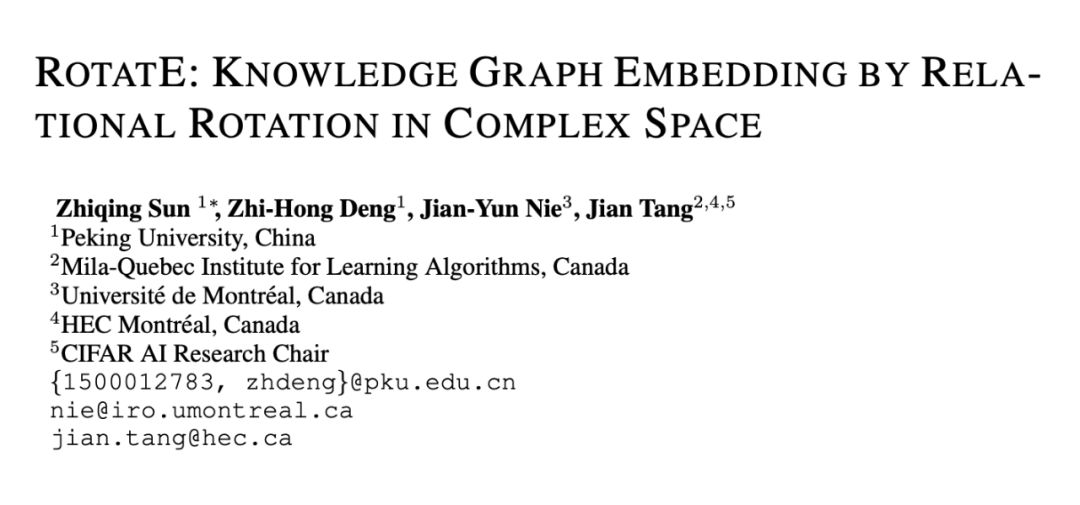 本文提出 RotatE 模型用于知识图谱嵌入,灵感来源于欧拉恒等式,表明了可以将虚数单位 i 视作在复数空间中的旋转。