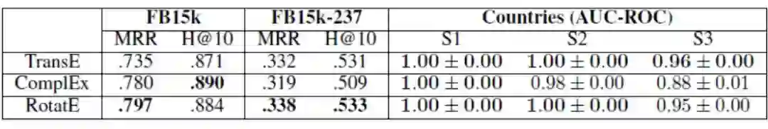 使用基于间隔的排序准则(margin-based ranking criterion)重新实现了 50 维的 TransE 模型,在 FB15k-237、WN18RR、WN18 上使用自我对抗负采样技术评估性能: