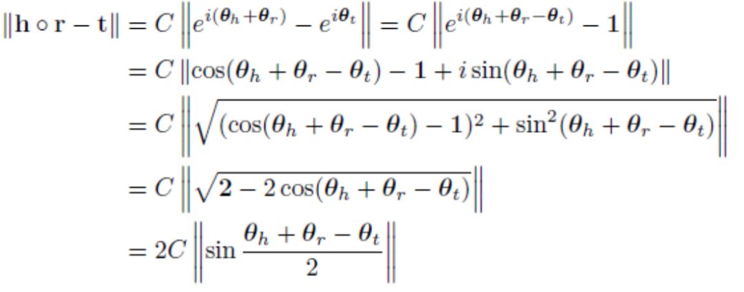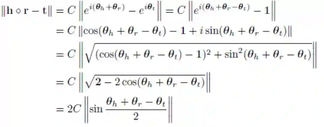 此时,如果在 TransE 模型中的嵌入是 h', r', t',令θh=ch',θr=ch',θt=ct',C=1/c,则,这就表明了 RotatE 可以弱化成 TransE。