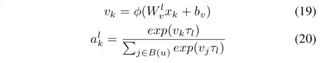 与注意力的协作过滤相似,a(l)(j) 是行为 j 的加权分数。我们假设并非所有行为都有相同的贡献,因此,为相关的信息较强(信息较差)的行为分配较高(较低)的权重是有意义的。权重得分计算如下: