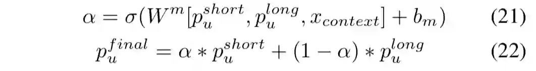 短期和长期部分都有优点和缺点。有必要融合一下这两个部分。我们设计了一种信息融合的自适应方法,而不是使用简单的方法,例如 p(final)(u)=p(short)(u)+p(long)(u)。设计的动机是哪个组件应该扮演更重要的角色取决于具体的上下文,比如什么时候(如果在之前的行为之后很快发生下一步行为,那么短期的偏好可能更具信息量)和什么信息(移动电话等某些 item 是从长期偏好中更好地推断,而从短期信息中更好地推断某些类别,如移动配件)。因此,动态信息融合是有益的,我们提出了以下基于注意的自适应融合方法: