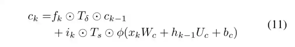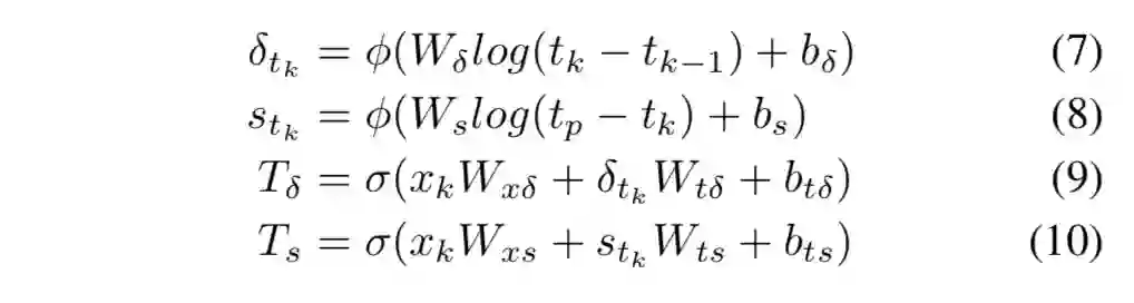 为了解决时间不规则问题,我们修改了 LSTM 中的门控逻辑,使其对时间变化敏感。我们介绍两个时间感知特征,即时间间隔特征δ(tk) 和时间跨度特征 s(tk),如下所示: