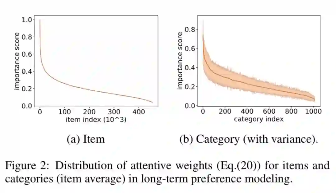 长期偏好部分的注意力机制 为了验证等式(18)是否能够学习不同 item 的区分重要性分数,我们在整个数据集中输出等式(20)中 item 的权重值。为了更好地说明,对于每个类别,我们最多抽样 1000 个 item,忽略少于 100 个 item 的类别。我们根据 item 的标准化重要性得分对其进行排序,并绘制图 2a。对于每个类别,我们计算该类别下所有 item 得分的平均值和方差,并绘制图 2b(得分按 1e-5 进行缩放)。我们可以观察到,item 被分配有区分性的分数,很少 item(少于 2%)被分配一个大于 0.5 的标准化的分数。