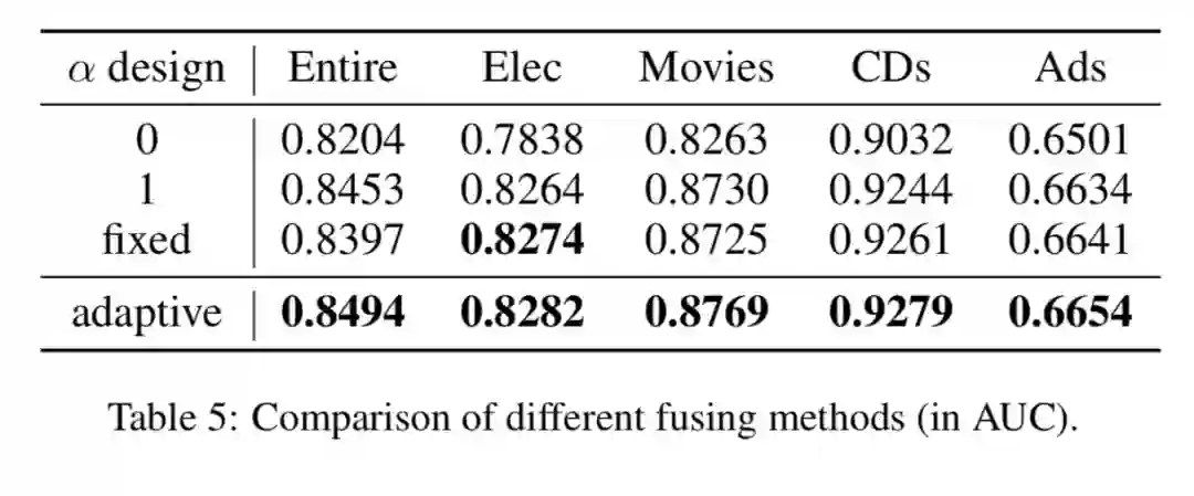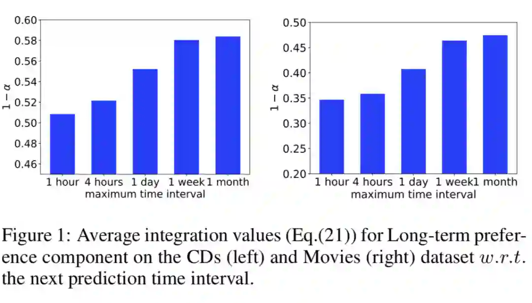 自适应融合的有效性 表 5 展示了等式(22)中α的各种选择。α=0 和α=1 分别表示仅使用长期或短期组件。α=fixed 意味着我们根据经验为每个数据集搜索一个固定的最佳值(类似于两个组件的端到端集成)。我们观察到,短期组件总是明显优于长期组件,因此有时这两个组件的简单组合甚至比短期组件更糟糕。自适应融合机制是必要并且有效的。为了直观地了解α将如何随上下文变化,我们根据用户最后一次行为的时间间隔拆分测试实例。例如,1 小时意味着我们想要预测的行为发生在用户最后一个行为之后的 1 小时内。图 1 显示了结果。有一个明显的趋势,即长期组件的重要性随着时间间隔的增加而增加,这符合我们的假设。