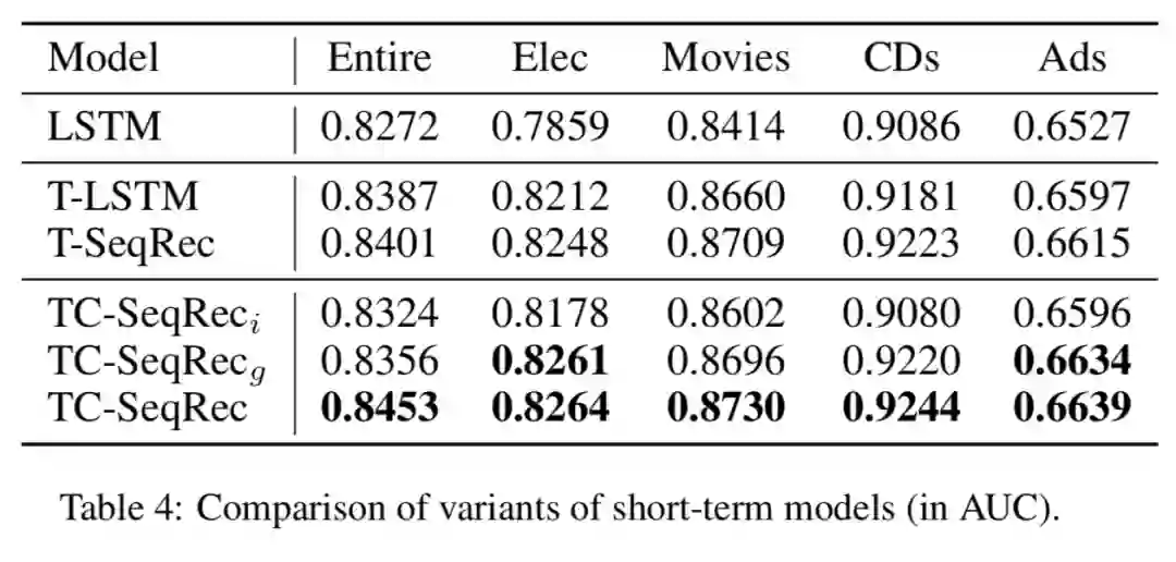 短期偏好部分的模型变体 为了验证我们的时间感知和内容感知控制器的设计对于短期偏好建模是否必要和有效,我们研究了几种变体。表 4 显示了结果。所有其他模型都优于 LSTM,这表明考虑复杂的用户行为模式确实有意义。T-SeqRec 是我们的短期偏好模型,只启用时间感知控制器。与 T-LSTM 相比,T-SeqRec 不仅使用时间间隔特征,而且还使用时间跨度特征。TC-SeqRec* 是启用内容感知控制器的不同方法,其中 i 表示 item 的注意力分数(等式(13))应用于输入特征,而不是 cell 和隐状态,g 表示我们使用最后一个状态作为短期偏好,而不是平均所有隐状态(等式(17)通过与这些不同的变量进行比较,我们可以发现时间感知和内容感知控制器都有利于短期用户建模。