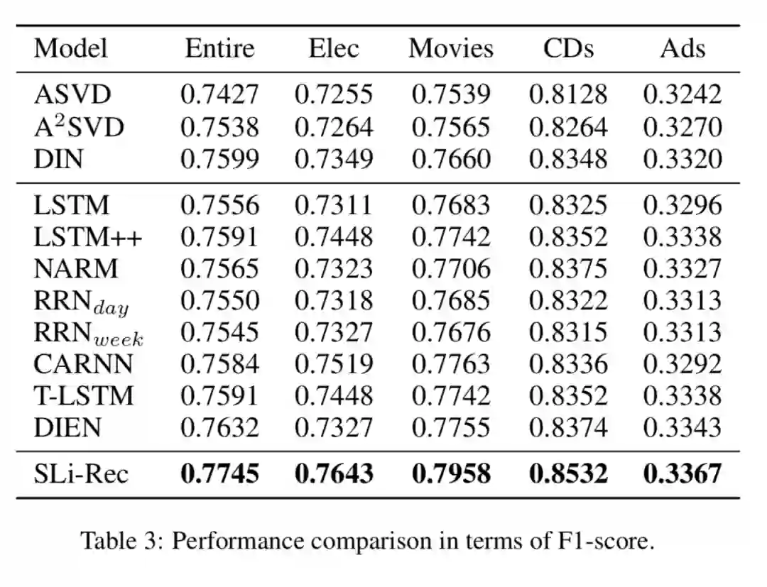 对比 baseline 表 2 和表 3 分别显示了不同模型在 AUC 和 F1 得分方面的总体表现。ASVD、A2SVD 和 DIN 是在没有序列机制情况下建模的,而其他模型则有序列组件。A2SVD 和 DIN 优于 ASVD,这表明为项目分配重要性评分是有益的。