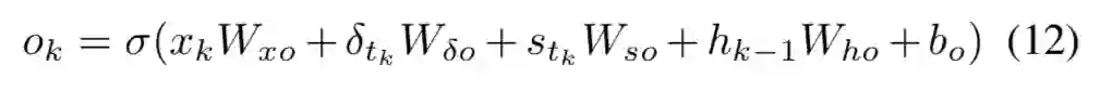 时间跨度特征 s(tk) 编码当前状态 tk 和预测状态 tp 之间的绝对时间距离,时间间隔特征δ(tk) 编码两个连续状态之间的相对时间距离。我们添加了一个全连接层,将时间感知特征转换为稠密向量,然后相应地计算时间门(T(δ) 和 T(s))。式(4)现在改为