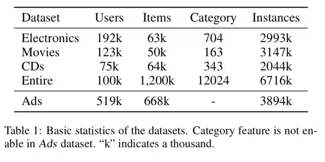 评估指标 在第 3.3 节中,我们将推荐任务定义为一个二分类问题,因此我们使用 AUC 和 F1 评分作为评估指标。AUC 衡量一个正样本比随机选择的负样本排名高的概率。F1 分数是精准率和召回率的调和平均数。这些指标从不同方面总结了模型的性能。
