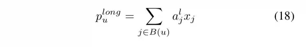 不是使用最后一个隐藏状态作为用户表征,即 p(u)(short)=h(~)(k),而是我们通过所有隐藏状态的加权平均值来定义用户的短期偏好: