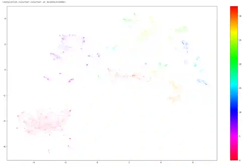 我们可以通过使用UMAP将数据嵌入到二维空间,并使用matplotlib对聚类进行着色,从而将产生的聚类可视化。有些聚类很难被发现,因为可能会有>50个主题生成,但一些主题下的语句数(在图中就是小点数)过少。