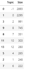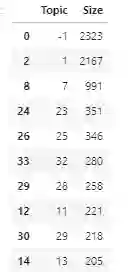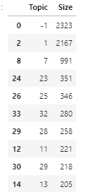 tf_idf, count = c_tf_idf(docs_per_topic.Doc.values, m = len(data))top_n_words = extract_top_n_words_per_topic(tf_idf, count, docs_per_topic, n=20)topic_sizes = extract_topic_sizes(docs_df); topic_sizes.head(10)