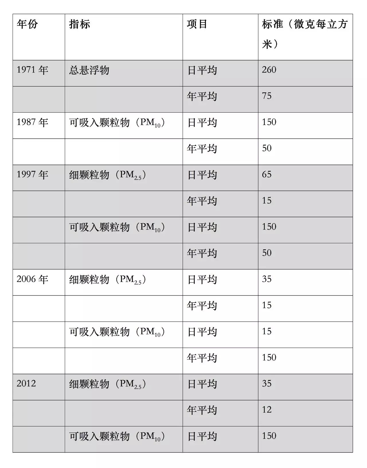 自1970年以来, 颗粒物浓度上限在不断降低。当1970年《清洁空气法案》刚刚颁布的时候,环保局制定的标准针对总悬浮颗粒物,日平均值是260微克每立方米,年平均值是75微克每立方米。如果用现在眼光看,当时的“达标”空气也是污染的状态。但是随着时间的推移,颗粒物的标准发生很大变化。标准浓度值也不断降低,现行标准是针对细颗粒物,日平均值为35微克每立方米,年平均值为12微克每立方米。同时,人们关注的颗粒物越来越“小”:从总悬浮物(TSP)换为可吸入颗粒物(PM10),直到现在的细颗粒物(PM2.5)。