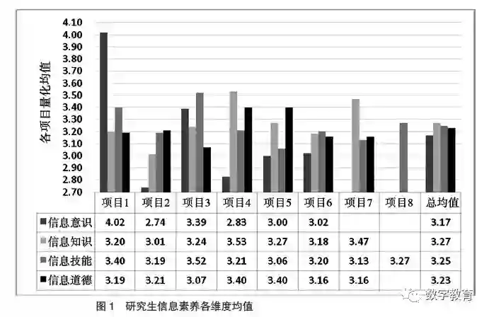 由图1 可知,信息意识的量化总均值为3.17,其中项目1 量化均值较良好,项目2 和项目4 的量化均值相对较低,说明虽然大部分研究生都能较好地意识到信息素养是研究生阶段的必备能力,但对信息的捕捉能力和专业动态的关注度有待加强。信息知识的量化总均值为3.27,信息技能的量化总均值为3.25,信息道德的量化总均值为3.23,各项目间的量化均值差异较小,说明虽然当前研究生对信息知识、信息技能和信息道德基本能把握,但把握程度较为一般。研究生信息素养的总量化均值为3.23,说明当前研究生信息素养的整体状况较为一般,研究生信息素养教育的成效确实不理想,有较大的提升空间。