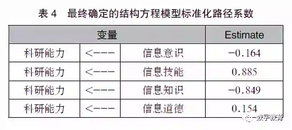 参照最终确定的结构方程模型的整体拟合效果和标准化路径系数,其中结构方程模型标准化路径系数如表4 所示,可推断出假设1 和假设2 被否定,假设3 和假设4 被证实。信息素养4 个维度的Estimate 数值加权总和仅为0.026,也就是说,研究生信息素养对科研能力的促进作用虽然很微弱,但是确实是存在的,主要表现在信息技能和信息道德对科研能力有一定的积极影响,且研究生的信息技能对科研能力的影响要比信息道德对科研能力的影响大。因此,提升与强化研究生信息素养中的信息技能和信息道德,确实可以在一定程度上提高研究生的科研能力。如若从培养研究生信息素养的角度来提高其科研能力,应着重从培养研究生的信息技能入手。