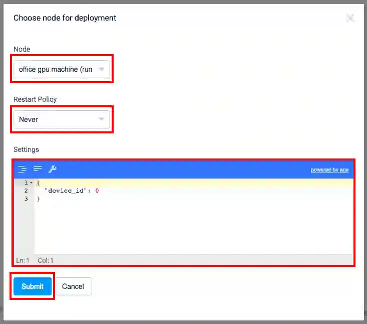 转到「我的模型」页面,然后单击「部署」按钮(1)。然后,在指定目标 GPU 机器和设备后,单击「提交」按钮(2)。因此,将创建一个新任务,并且一旦完成(3),你就可以将 API 请求发送到你的人员检测模型。