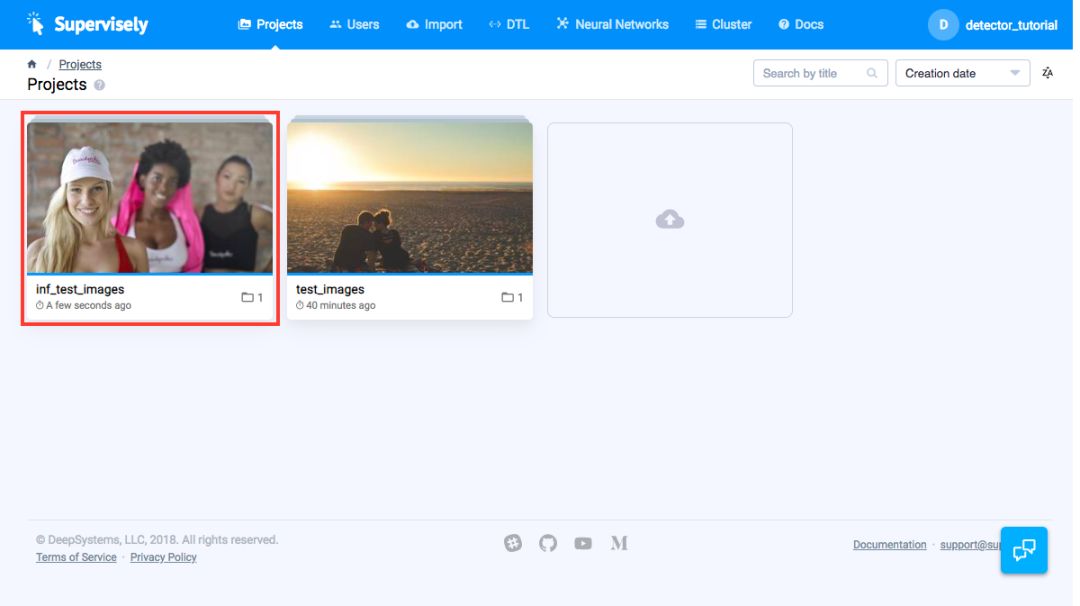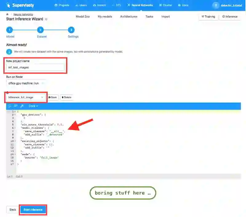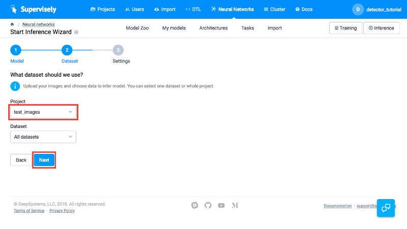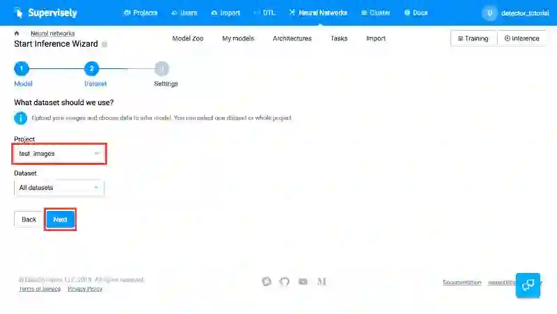 现在让我们在你的图像上测试我们的人物检测器。转到「我的模型」页面,然后单击「测试」按钮(1)。然后,你选择一个带有图像的项目来检测人物。在我们的例子中,它是「test_images」项目,然后单击「下一步」按钮(2)。然后,我们应该指定将存储检测结果的项目的名称。在我们的例子中,它是「inf_test_images」项目(3)。