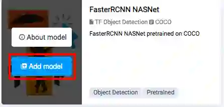 转到「Neural networks」->「Model Zoo」页面(1)。您将看到一系列用于语义分割和目标检测任务的预训练模型。如果将光标悬停在「FasterRCNN NasNet」上,您将看到「Add model」按钮(2)。点击后,模型将出现在「My Models」列表(3)。