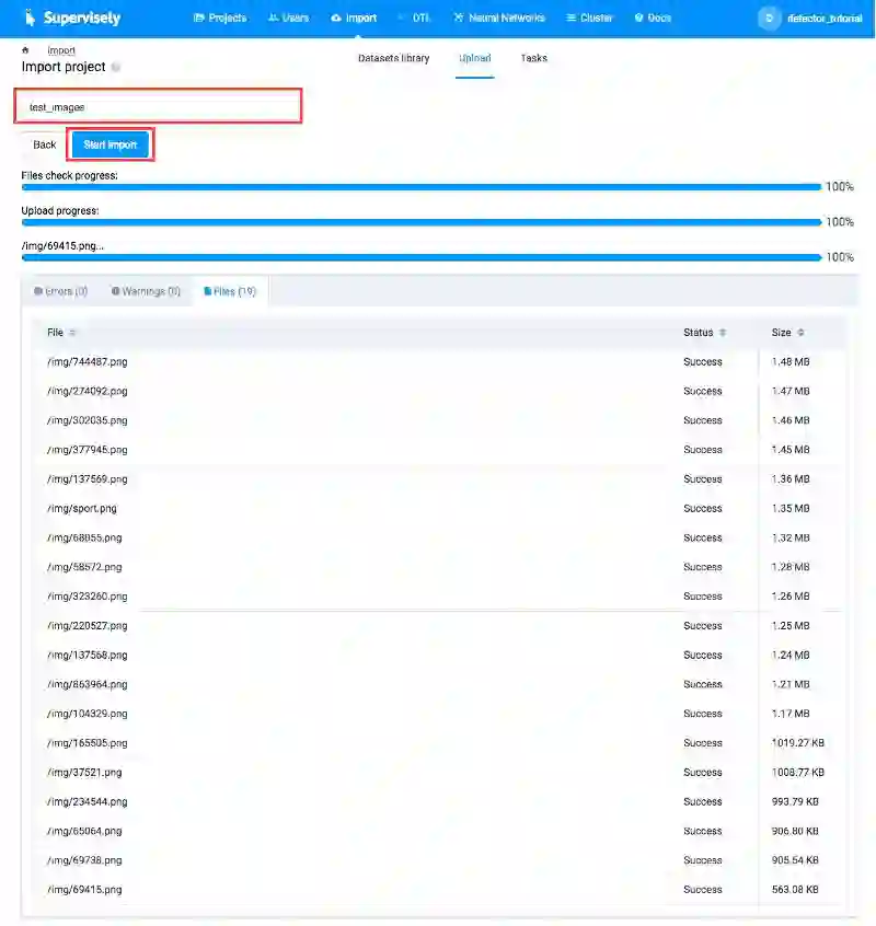 转到「Import」页面,然后拖放包含测试图像的文件夹(1)。将项目命名为保存图像的项目。在我们的例子中,项目名称是「test_images」。然后单击"start import"按钮(2)。导入完成后,转到「Projects」页面,检查包含你的图像的项目是否已创建(3)