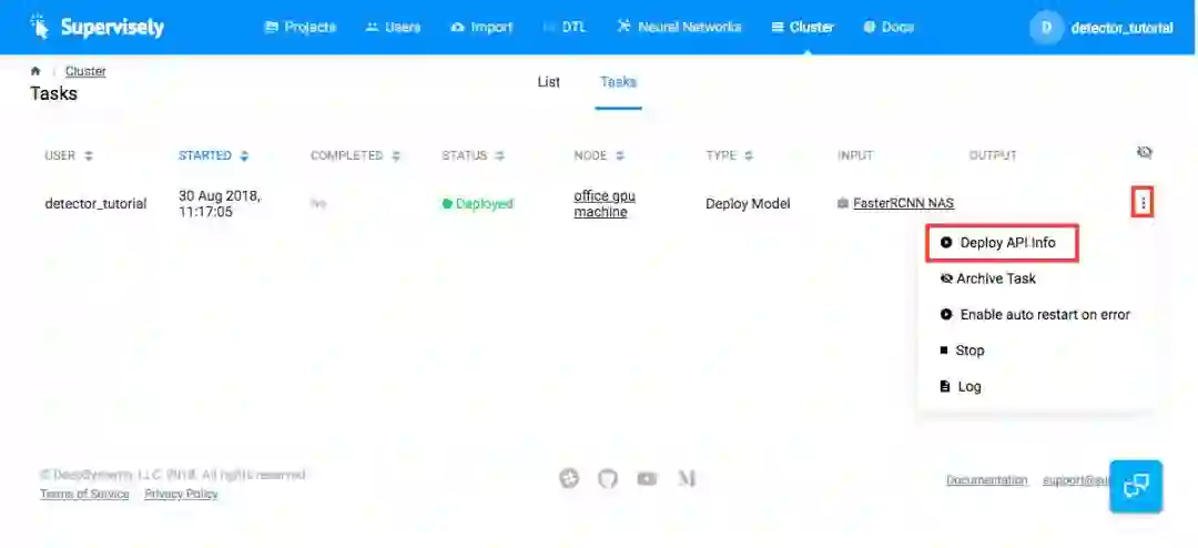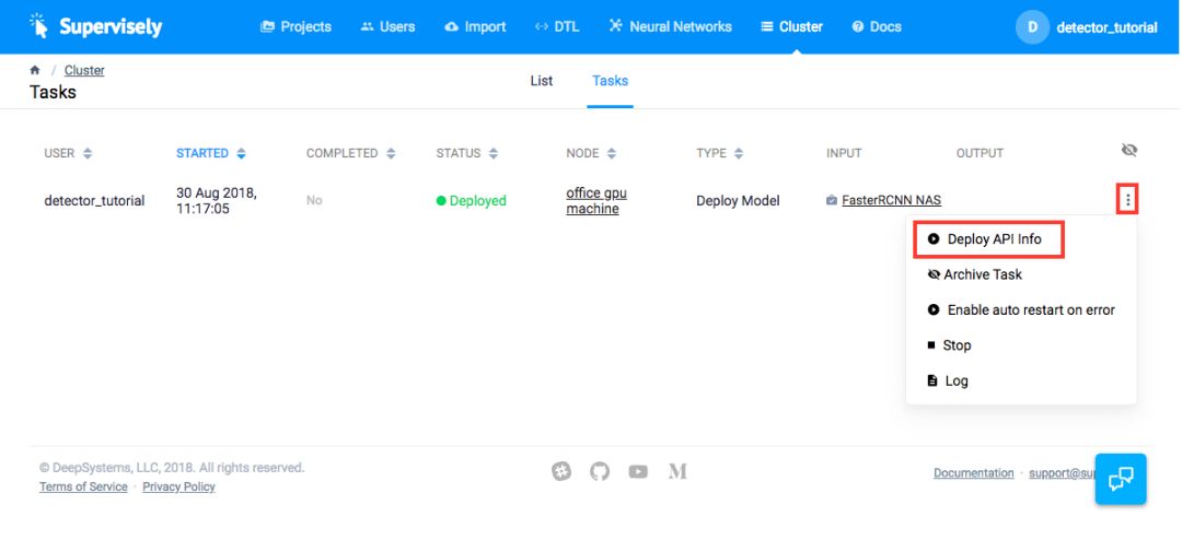 在调用 API 之前,我们需要获取令牌和 URL 信息。为此,在「Cluster-> Tasks」页面上单击上下文菜单(1)中的「Deploy API info」。在下一页,你将看到通过 API(2)使用我们的检测模型所需的所有信息。