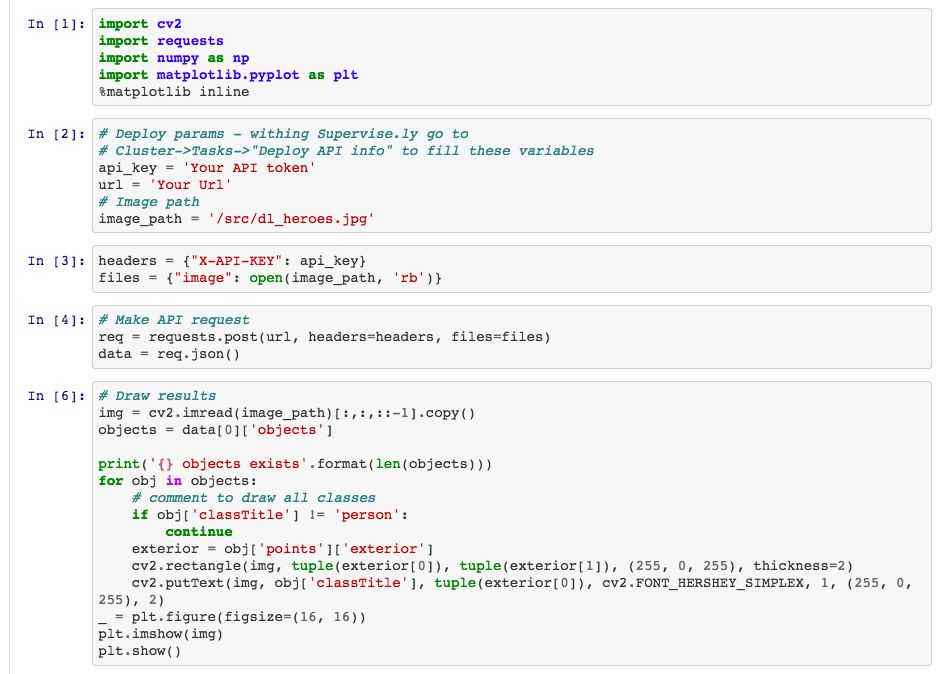 在将模型部署为 API 之前,最好可视化神经网络预测,以了解它是否符合要求。使用 Supervisely 非常简单:只需点击几下即可拖放图像并运行推理过程。