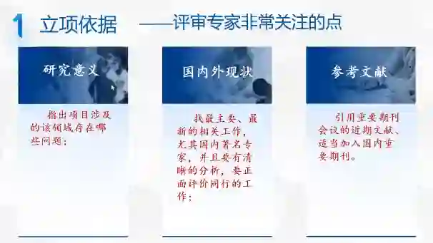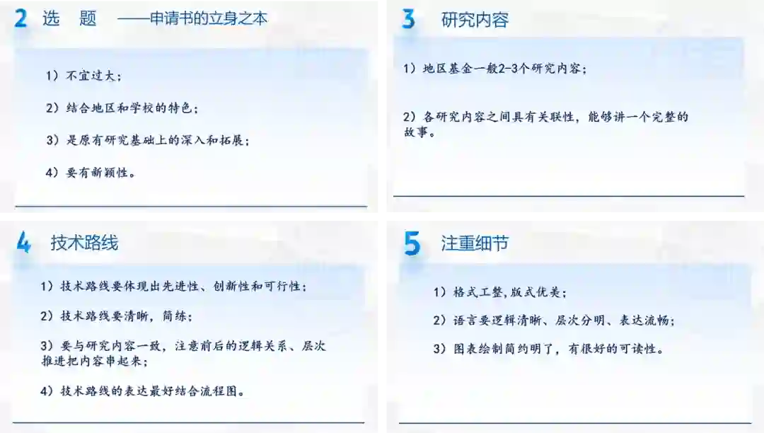 鄢博士通过结合自身经验和专家指导,介绍了申请地区科学基金项目的注意要点,主要包括以下方面:立项依据、选题、研究内容、技术路线和注意细节。此外,鄢博士也提醒了请同行专家帮助评阅的重要性。