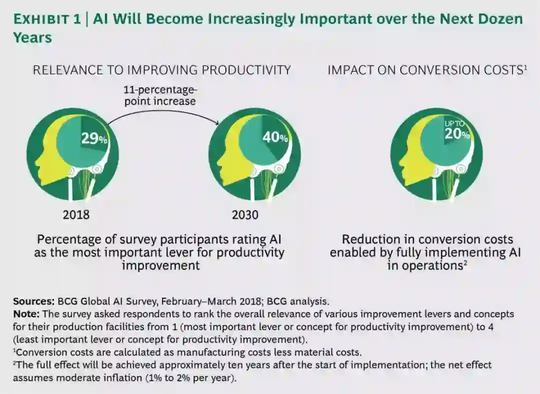 BCG 的一份分析发现,AI 的使用可降低制造商最高 20% 的加工成本,而这种减少最高有 70% 源自于更高的劳动生产率。