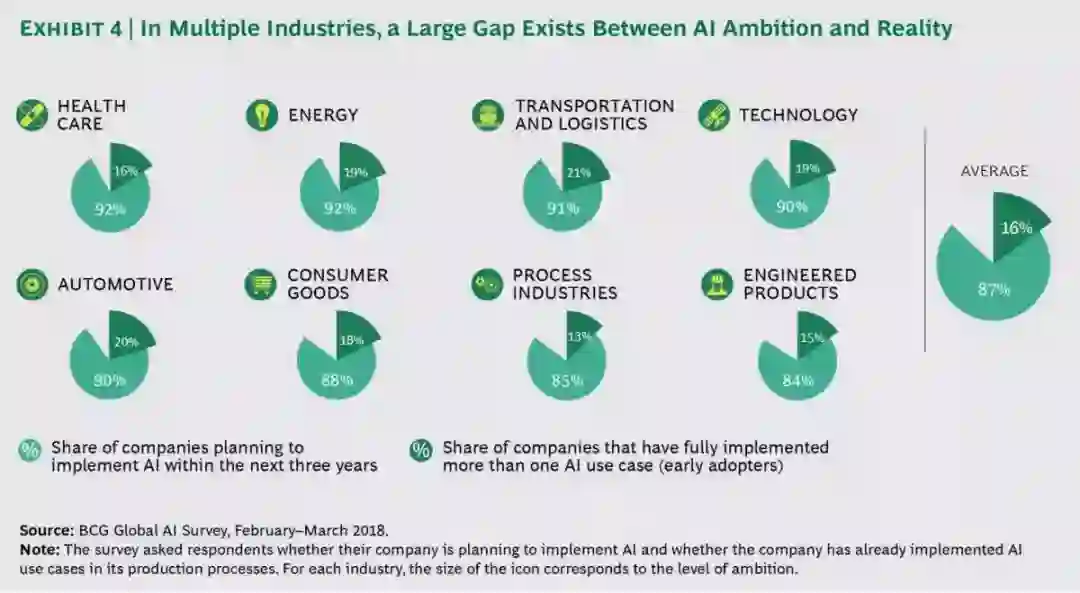 调查发现,交通、物流、汽车、技术公司处在 AI 采用的前沿,而加工产业(比如化工)就比较滞后。
