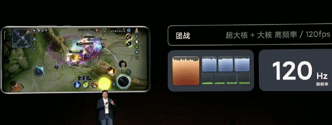 我们知道,从目前的一些骁龙 8 机型来看,这款芯片性能增强,但功耗也增加了,小米 12 的散热调教怎么样呢?雷军表示,小米 12 系列加入了动态性能调度技术,可以利用处理器瞬时高频处理好任务然后再降低频率。如果打王者荣耀的话,打开游戏、选人、对线和团战时大小核的负载都不一样。
