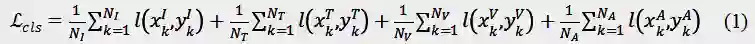 是交叉损失函数,I,T,V,A 分别表示图像、文本、视频和音频。