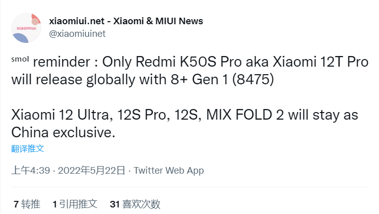 今日,爆料者 @xiaomiui 称,小米 Redmi K50S Pro 将搭载骁龙 8+,该机在海外的名称将是小米 12T Pro。此外,小米 12 Ultra、小米 12S Pro、小米 12S、小米 MIX FOLD 2 都将搭载骁龙 8+,不过都是国内独占。据悉,高通宣布基于骁龙 8 + 移动平台以及第一代骁龙 7 平台的终端会在 2022 年第二季度陆续上市,在官方的 PPT 中就有 Redmi 标志。