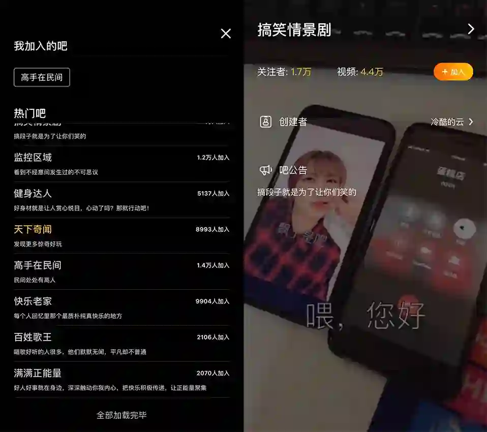 用户在观看到感兴趣的视频时,可以加入该内容所在的“吧”,下次观看时可以从“我加入的吧”快速进入相应内容合辑。这种内容分类和社区理念,将同类用户聚合到同一内容吧里,从而提高用户黏性和留存。