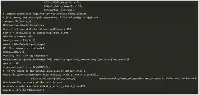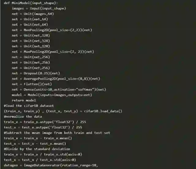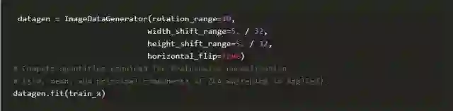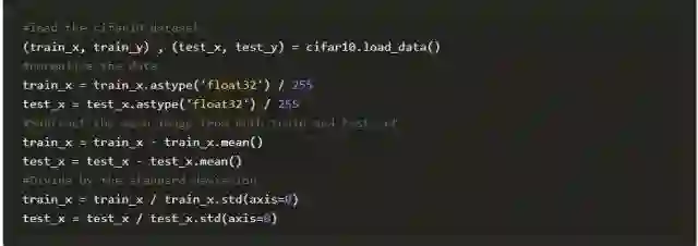 在上面的代码中,加载训练和测试数据后,我们从每幅图像中减去平均图像并除以标准偏差,这是一种基本的数据增加技术。对于更先进的数据增强,我们的图像加载过程会略有改变,Keras有一个非常有用的数据增强程序,可以简化整个过程。