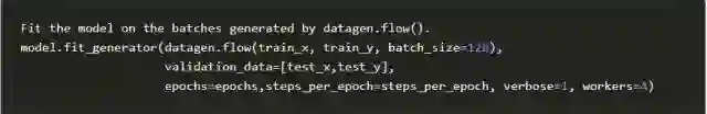 在上面,首先,我们指定了10度的旋转角度,高度和宽度都是5/32的偏移,最后是水平翻转,所有这些变换都会随机应用于训练集中的图像上。当然,还有更多转换存在,你可以查看可以为该类指定的所有参数。请记住,过度使用数据增强可能是有害的。