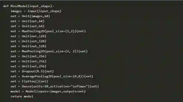 在这里,我们使用功能性API来定义我们的模型,我们从三个单元格开始,每个单元格有64个过滤器,后面是一个Max Pooling layer,将32*32图像缩小到16*16。接下来是3128个过滤器单元,然后是Pooling,在这里,我们的图像变成8*8。最后,我们有另外3个单元,256通道。请注意,每当我们将图像尺寸缩小2倍时,我们将通道数增加一倍。