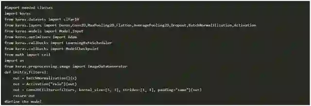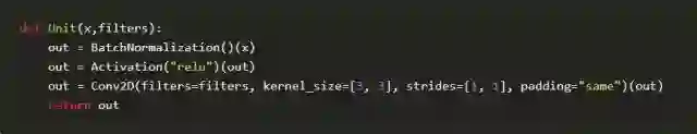 这里是我们的代码最重要的方面,单元函数定义了一个简单的图层,其中包含三个层次,第一个是我先前解释的Batch Normalization,接下来我们添加RELU激活,最后添加卷积,注意我是怎样用“预激活”的方式把RELU放在conv之前的。