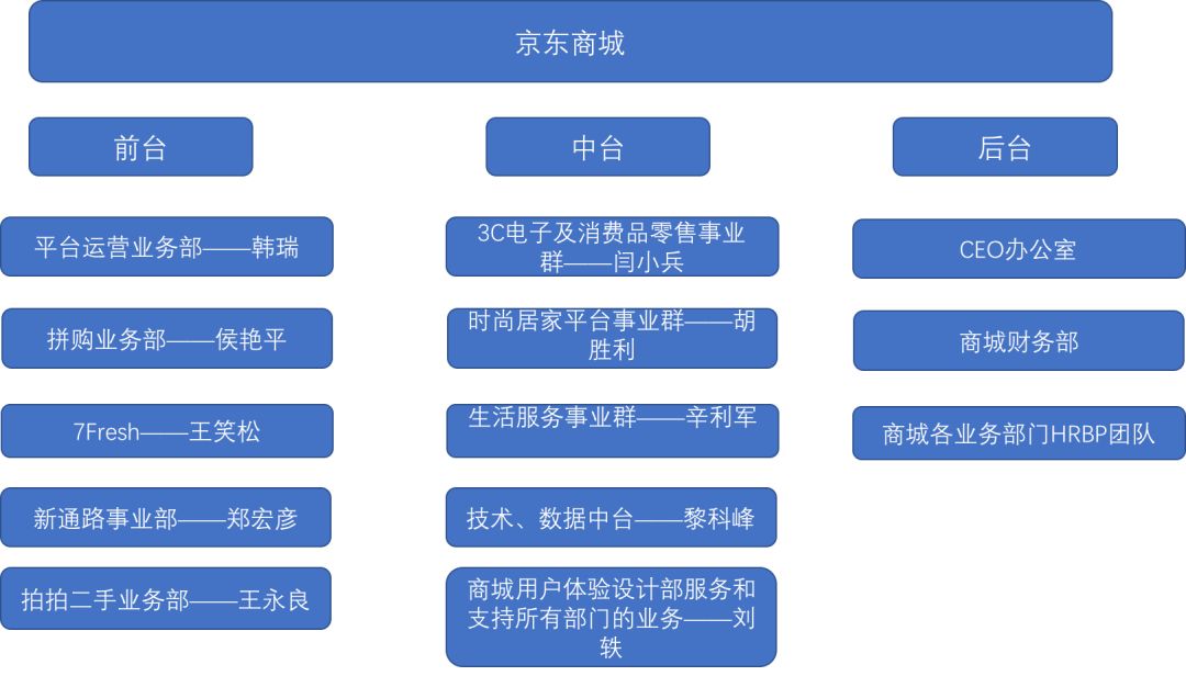 这场变革中,京东商城、京东物流、京东数字科技,形成三足并立的子集团结构,而这三个子集团的负责人皆是历经考验的10年以上嫡系老兵:徐雷,王振辉,陈生强。原来的京东商城三大事业群则直接向京东商城轮值CEO徐雷汇报,而京东商城则划分为了前台、中台和后台。