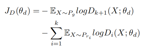 我们使用多类别分类目标函数,使判别器能够区分各类情感的真实文本与生成文本。假设有 k 个生成器,判别器则对 k+1 个类别计算 softmax 概率分布。第 i 个分数代表属于真实第 i 类情感文本的概率,第 k+1 个分数代表样本是由生成器生成的概率。判别器的目标函数是最小化:
