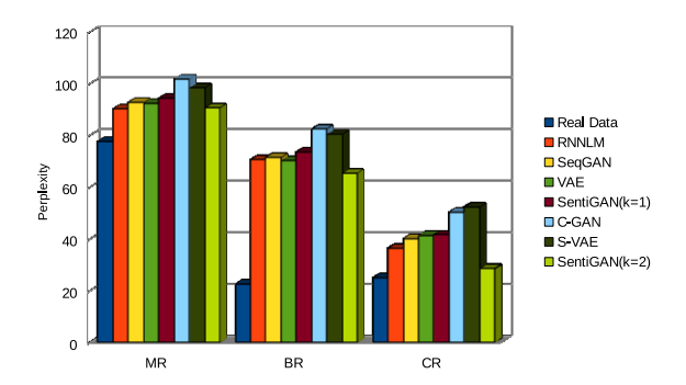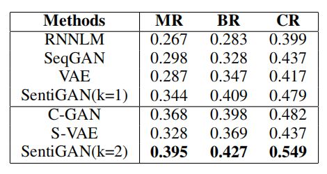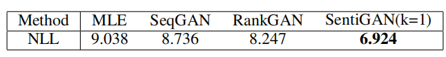 我们提出的 SentiGAN 解决了上述问题。首先,我们提出新的目标函数,通过最小化整体损失而不是最大化奖励来优化模型。其次,判别器使用多类别分类目标函数,可以让生成器更关注于生成他们情感标签的样本,而不与其他标签混淆,这一点提高了生成文本的情感准确性。我们使用一个情感分类器作为评价方法,来验证生成文本的情感准确度,以及其他指标(流畅度、新颖度、多样性、智能性)。